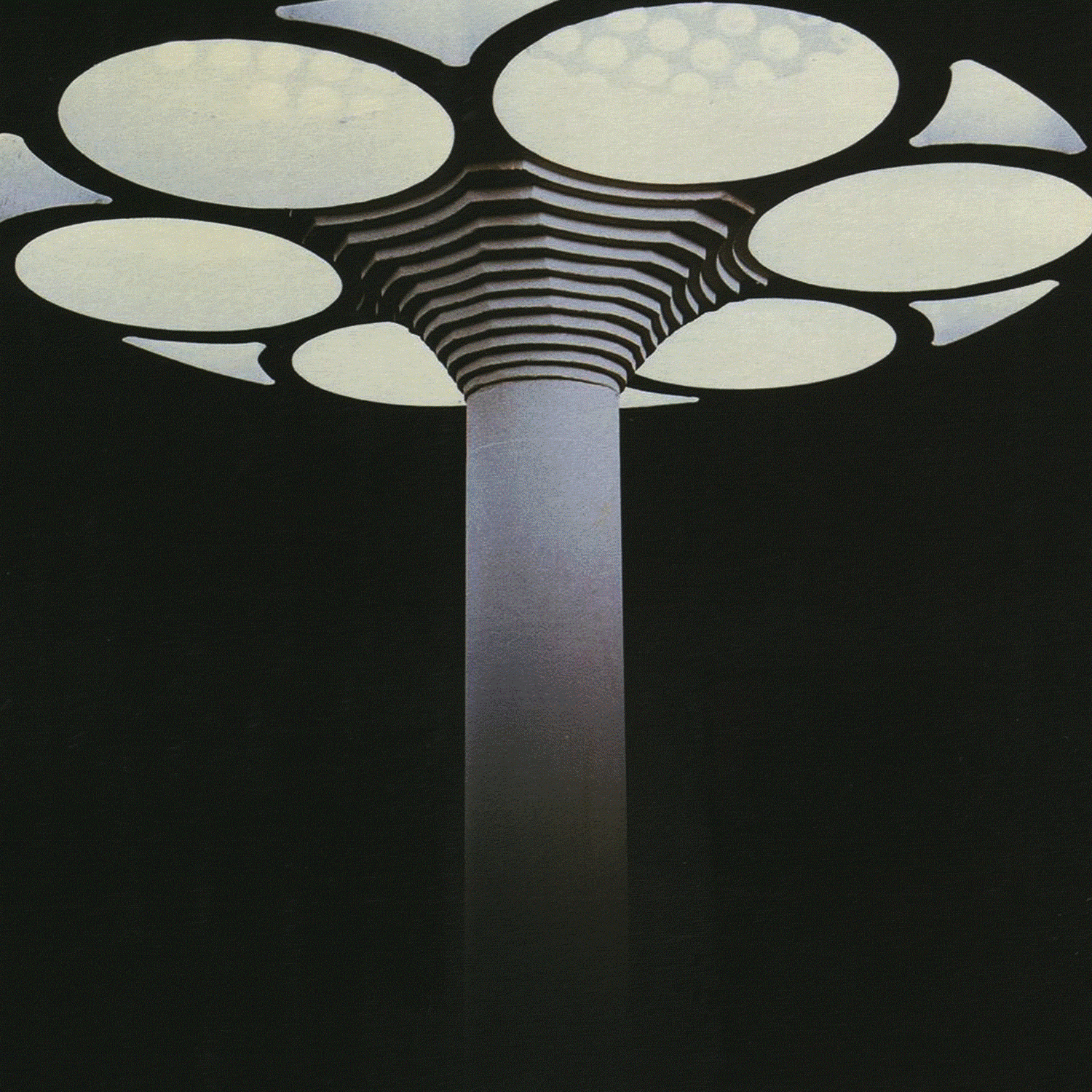 Anthracite and petroleum blue lit by factory yellow — retro sci-fi in rain-streaked glass and analogue glow.